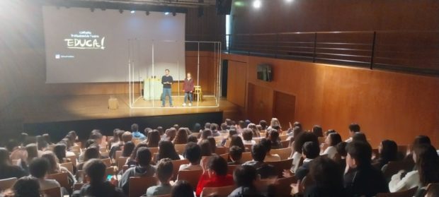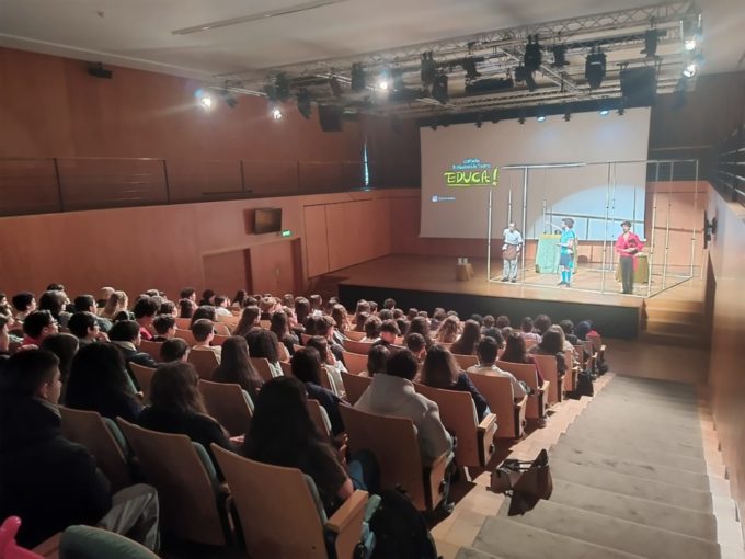 Na parte da manhã, as sete turmas assistiram, no auditório da Biblioteca Municipal Almeida Garrett, à representação da peça: “O Auto do Cubo: Enigmas Matemáticos e Comédia no Teatro”, apresentada pela Companhia Profissional de Teatro Educa. A peça leva a palco uma aventura com um cozinheiro, um futebolista e um bailarino, que estão presos num cubo gigante sem saída aparente. Para regressarem à liberdade, as três personagens terão de superar as suas diferenças e resolver, com a ajuda do público, enigmas matemáticos. Mais do que um espetáculo de entretenimento, esta iniciativa reforçou a importância de abordar a matemática de forma lúdica e contextualizada. Ao transformar conceitos lógicos em ferramentas essenciais para a superação de desafios, os estudantes descobriram que o raciocínio matemático pode ser uma aventura estimulante, essencial no seu dia a dia.