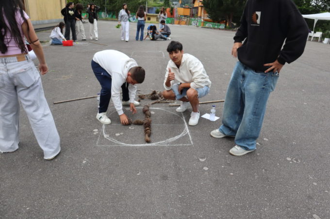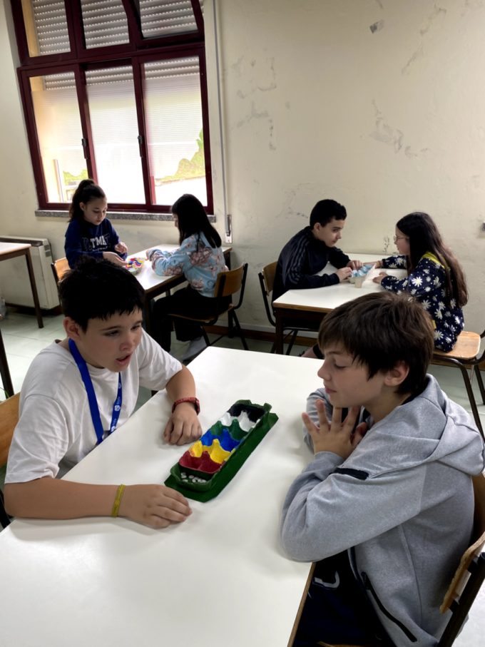 A manhã prosseguiu com diversos ateliês e atividades práticas. Os alunos criaram pigmentos naturais, pintaram formas com os corantes produzidos, jogaram com desafios matemáticos, fizeram origamis, exploraram a flora do jardim, participaram em jogos tradicionais e criaram mandalas com elementos da natureza. Cada atividade foi uma oportunidade para aprender de forma lúdica, criativa e consciente.