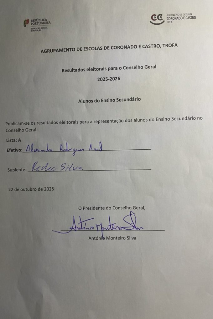 De acordo com o processo eleitoral realizado neste Agrupamento para o representante dos alunos do ensino secundário no Conselho Geral, para o ano letivo de 2025-2026, torna-se público que foram eleitos os seguintes elementos da lista A: